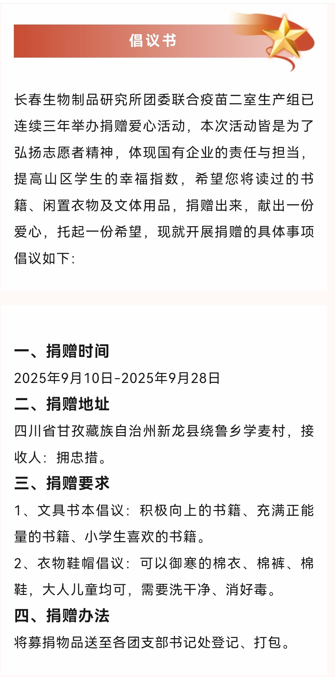 这已是长春生物制品研究所团委联合青年文明号开展公益捐赠的第三个年头。三年来,从最初的尝试到如今的常态化行动,从零星的爱心到全员的参与,公益的种子已在企业内部生根发芽。每一次捐赠,不仅为偏远地区的孩子送去了物质温暖与知识滋养,更以实际行动诠释了“奉献、友爱、互助、进步”的志愿者精神,彰显了中央企业服务社会、回馈人民的责任担当。